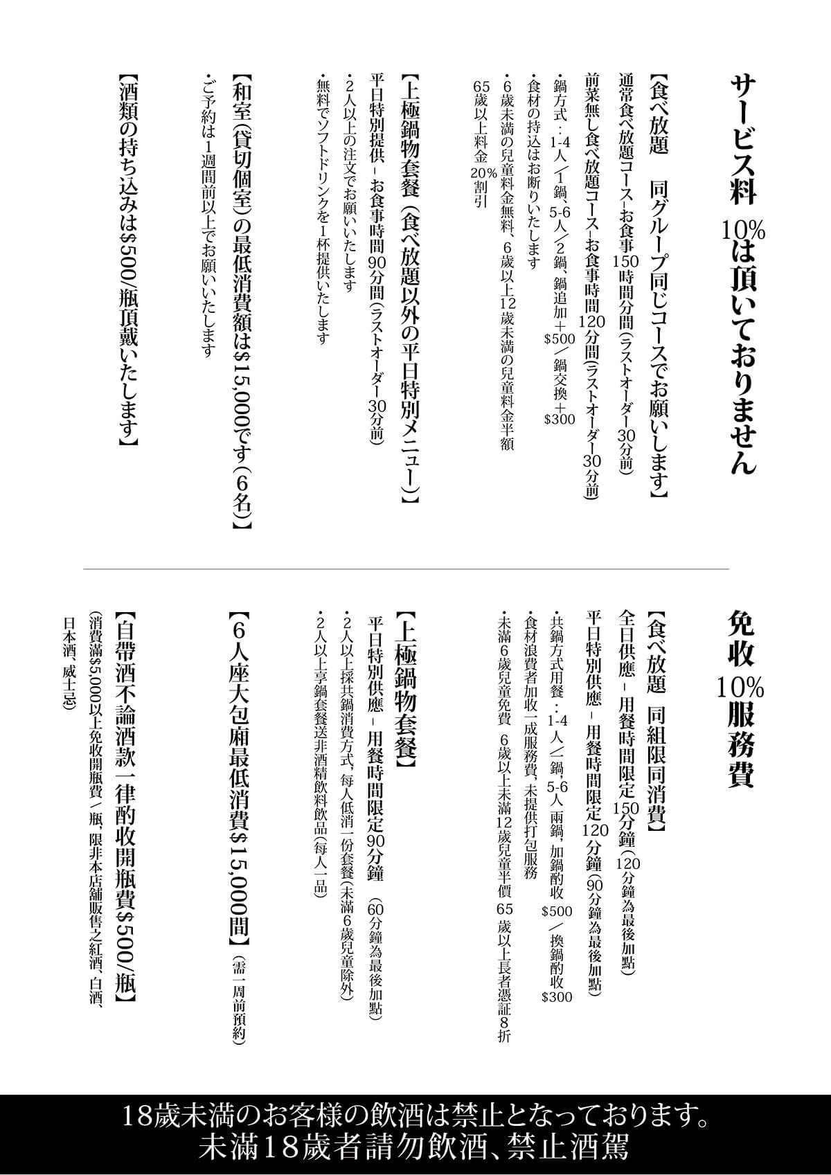 - 鍋方式:1-4人/1鍋、5-6人/2鍋、鍋追加+$500/鍋交換+$300