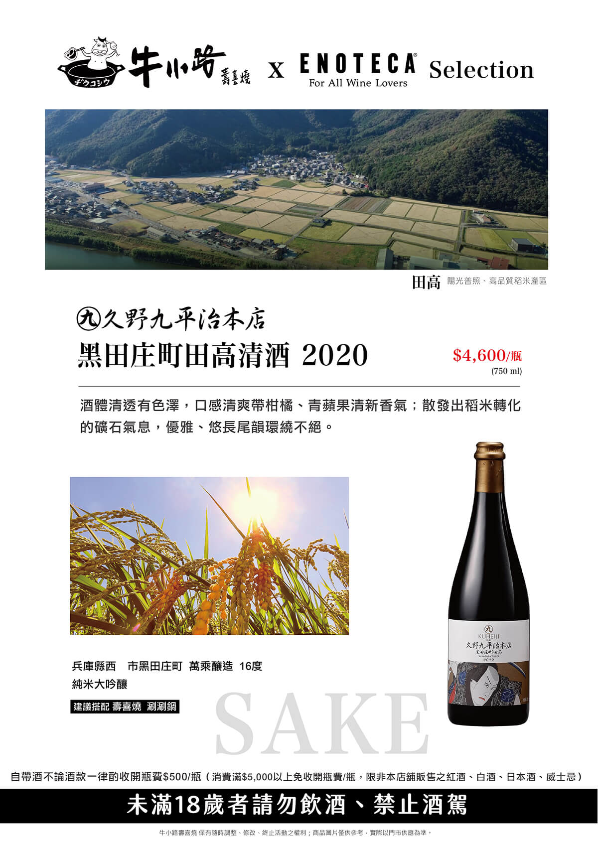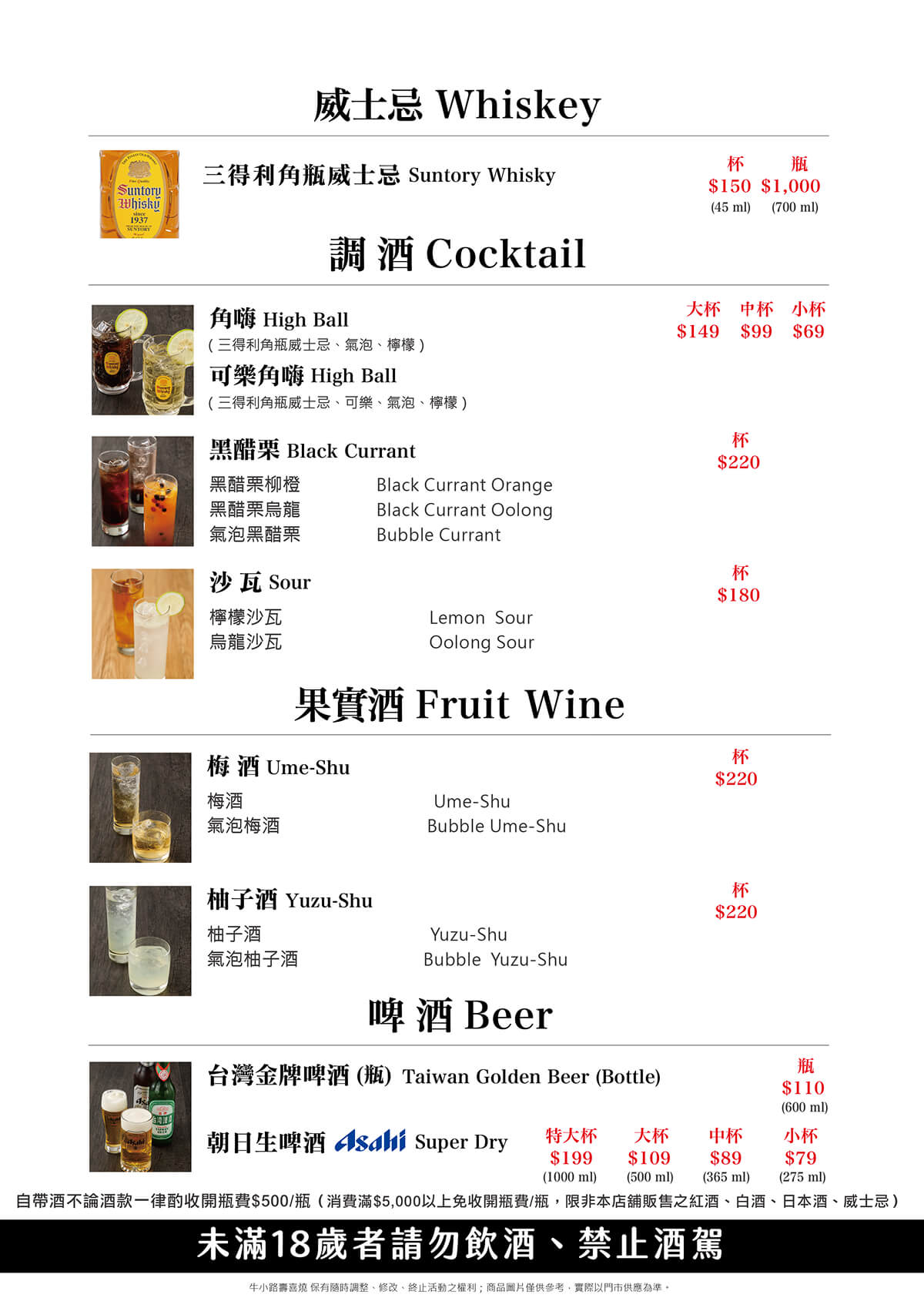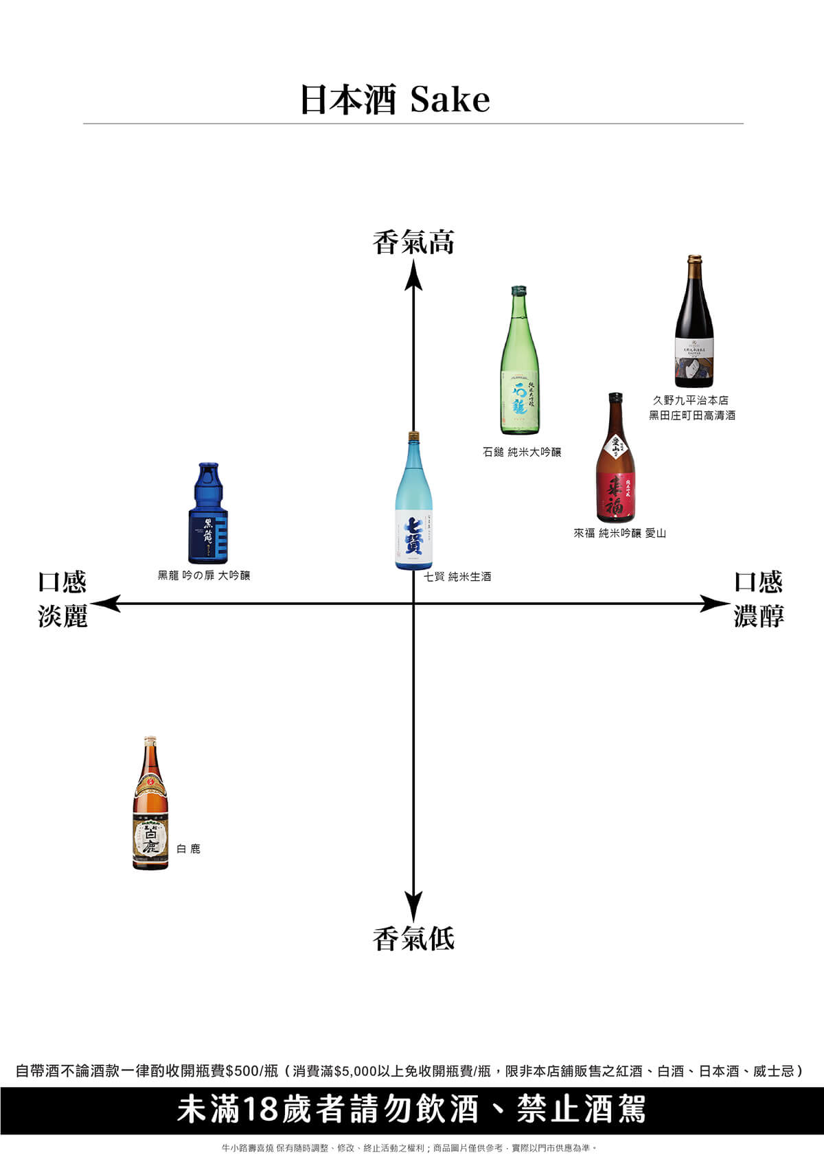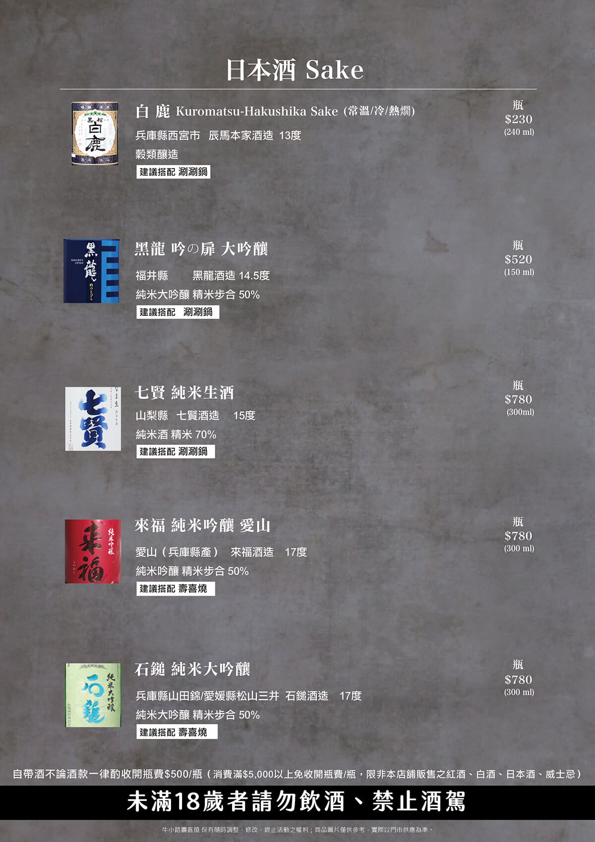 自帶酒不論酒款一律酌收開瓶費$500/瓶(消費滿$5,000以上免收開瓶費/瓶,限非本店舖販售之紅酒、白酒、日本酒、威士忌)