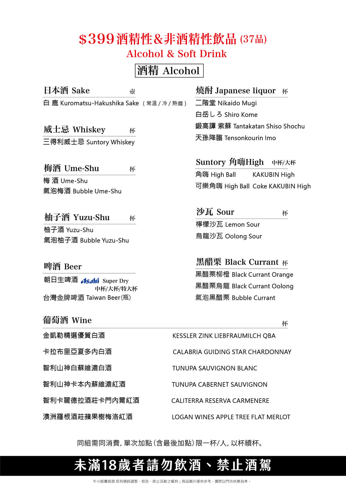 $399酒精性&非酒精性飲品 (37品)
